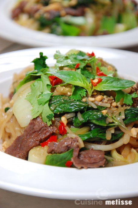 Nouilles de riz sautées, au boeuf mariné, pak choi, gingembre et herbes fraîches (sublimes, donc)